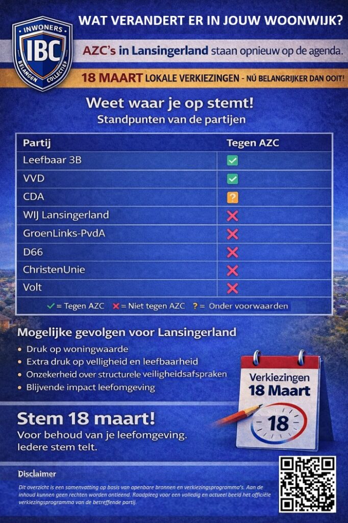 Stop AZC Lansingerland Inwoners Belangen Collectief Lansingerland Wie kiest voor de Lansingerlanders? Dit staat er op het spel: Veiligheid. Leefbaarheid. Betaalbare woningen. Deze flyer is een uitgave van IBC Lansingerland Klik hier voor meer informatie > DisclaimerIBC is een onafhankelijk burgerinitiatief en geen politieke partij. De inhoud op dit platform is informatief van aard en gebaseerd op openbare bronnen en verkiezingsprogramma’s. Aan de inhoud kunnen geen rechten worden ontleend. © 2026 Inwoners Belangen Collectief
